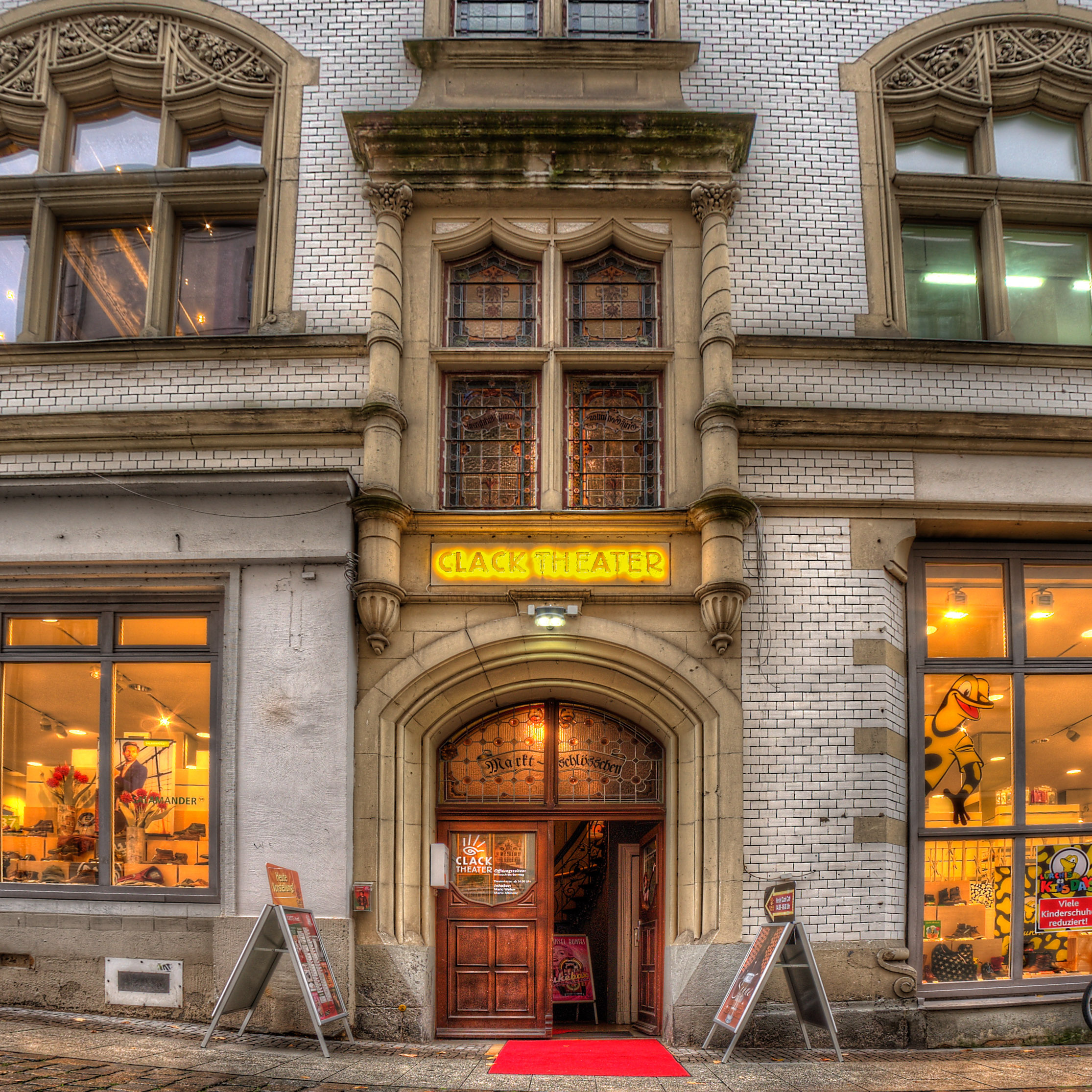 Das CLACK Theater eröffnete seine Pforten in dem bis heute als „Marktschlösschen“ bekannten Ensemble am 10. Mai 2008. Verantwortlich dafür zeichnen Stefan Schneegaß und Mario Welker, die Sie auch hier und heute herzlich begrüßen. Nehmen Sie sich einen Moment Zeit, lassen Sie ein wenig Blicke und Gedanken schweifen und denken Sie kurz an jene, die vor 100 Jahren vielleicht genau an die gleichen Stellen in den Raum schauten, an die Sie gleich Ihren Blick wieder heben werden. Willkommen!